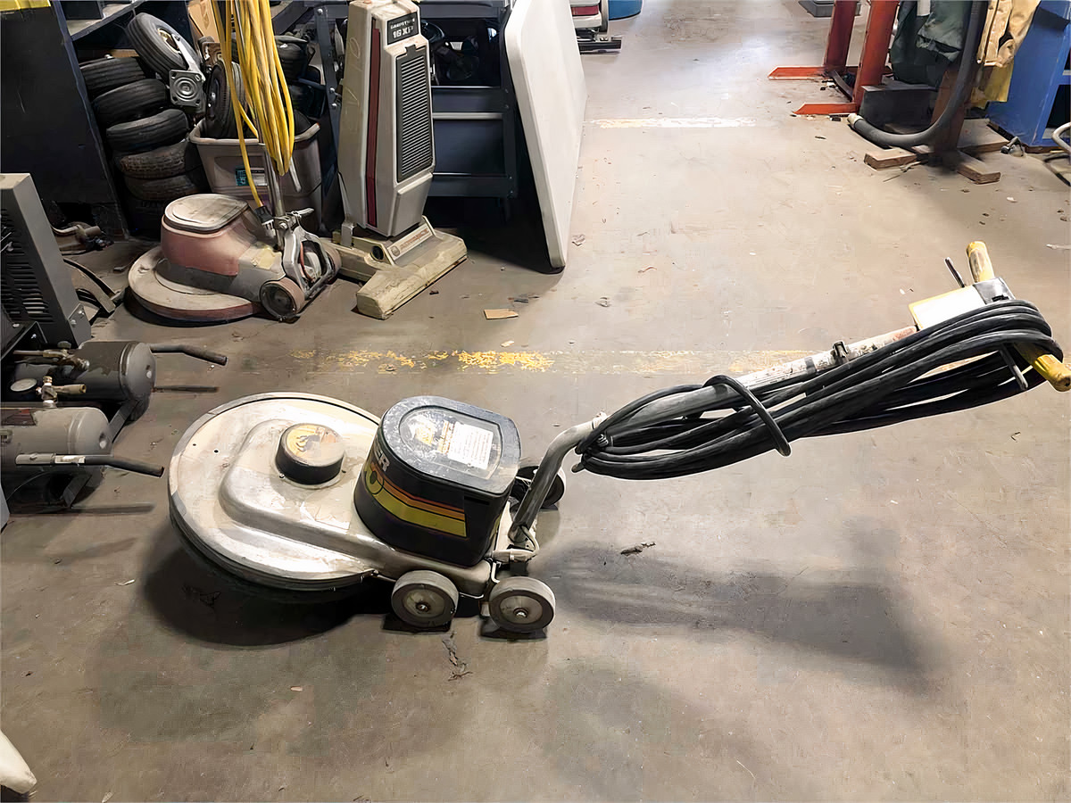 This versatile machine functions as a floor buffer, burnisher, spray buff, or damp scrubber, featuring a 20-inch cleaning path and operating at 1500 RPM. It is in good mechanical condition.