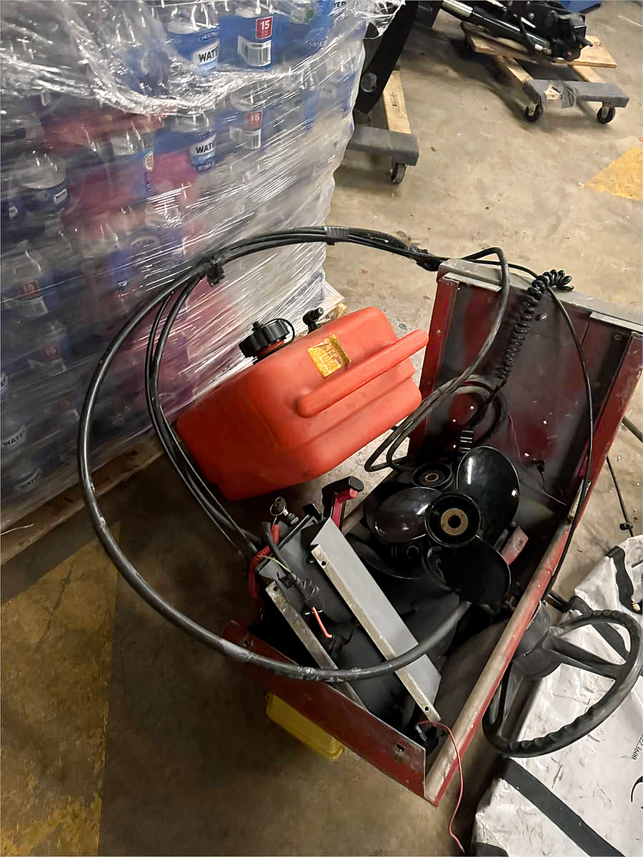 Complete boat steering console equipped with a powerful 25HP motor, a gas tank, and a propeller. Sold as is. Pick up only.